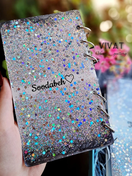 دفتر کلاسوری رزینی ساخته شده به سلیقه ی شما قابل در طرح و رنگ دلخواه شما قابل با اسم و جمله دلخواه شما برگه ها قابل تعویض میباشند مناسب برای آقایان و خانمها دفتر کلاسوری سایز A6 طرح آلما